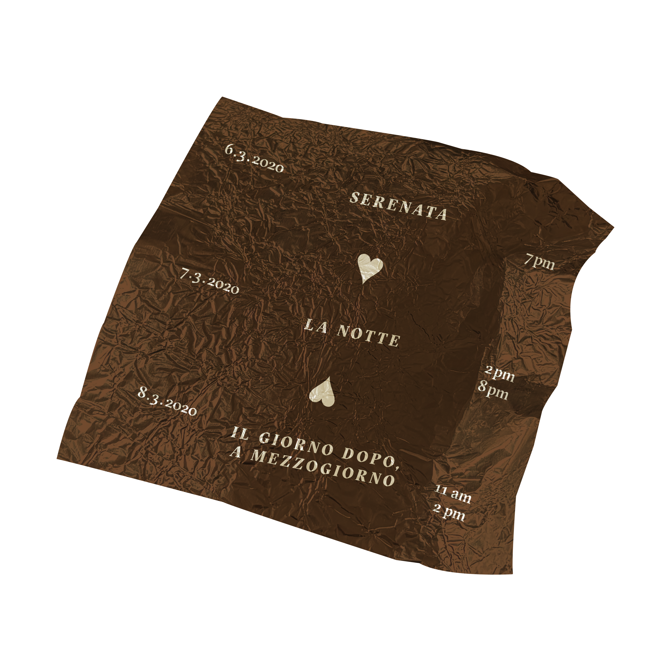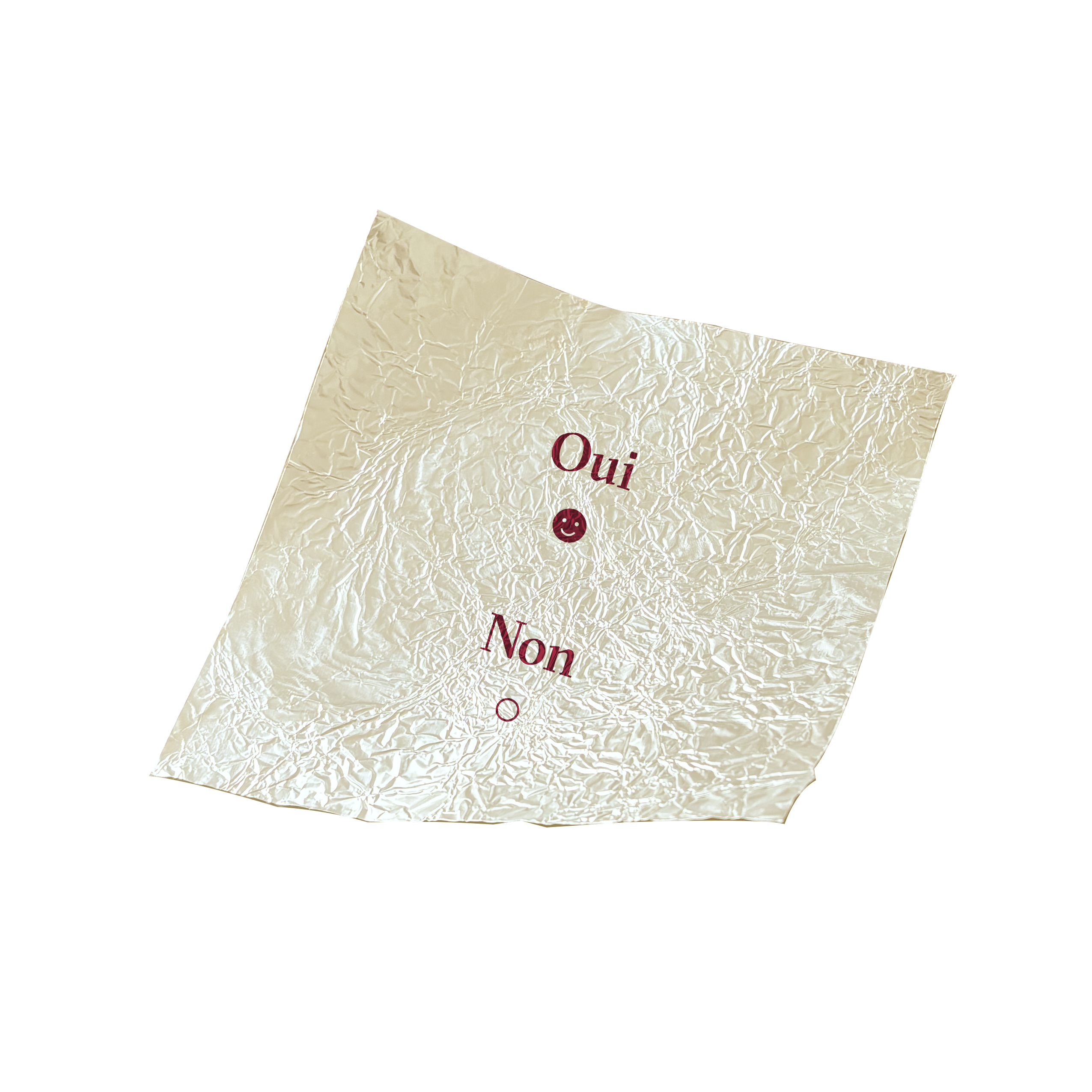 Des invitations au format de petits billets secrets, enveloppées dans un papier scintillant de confiserie, collant et imprégné d’une odeur sucrée.